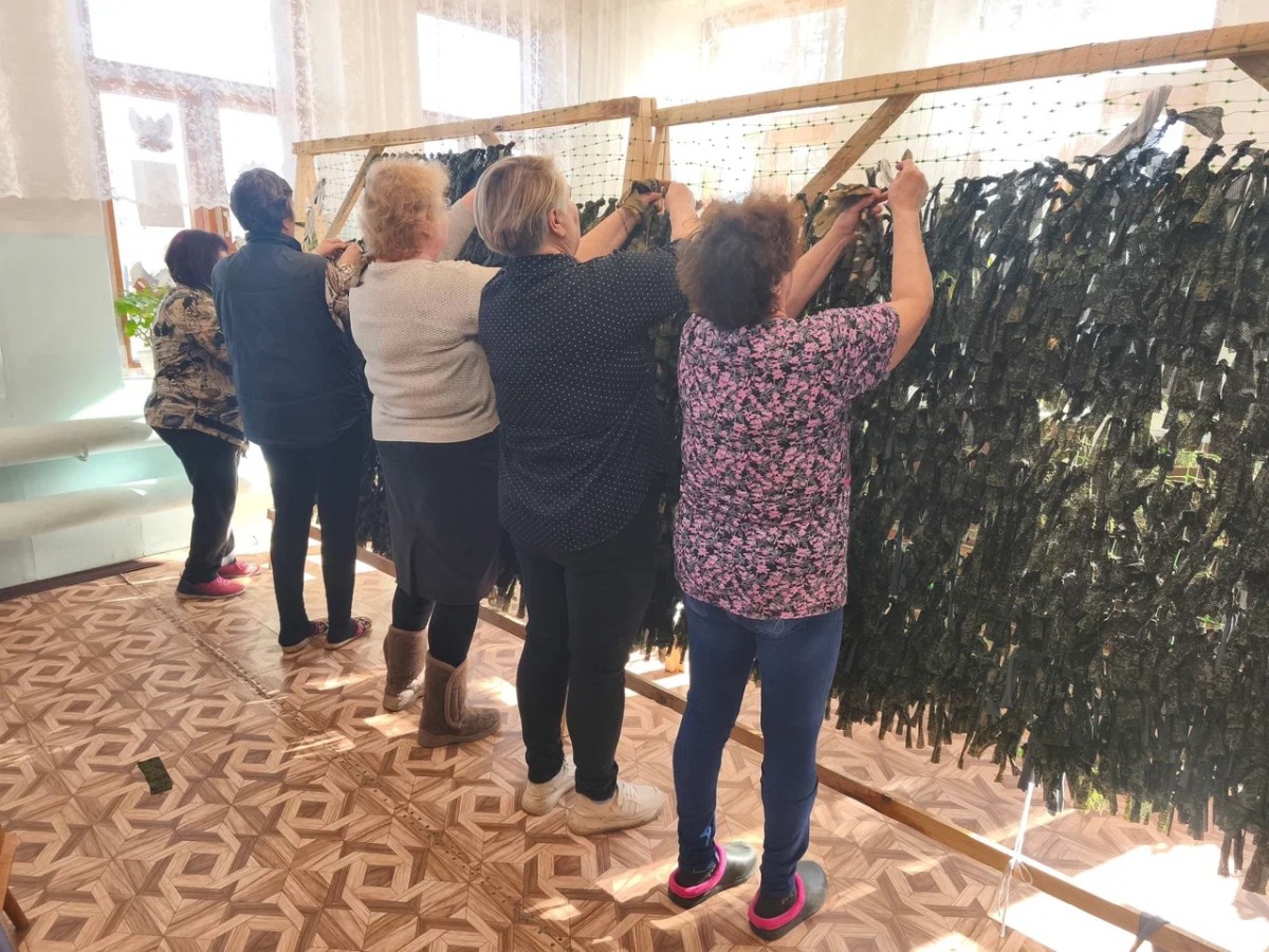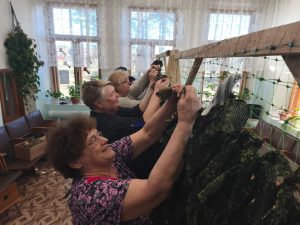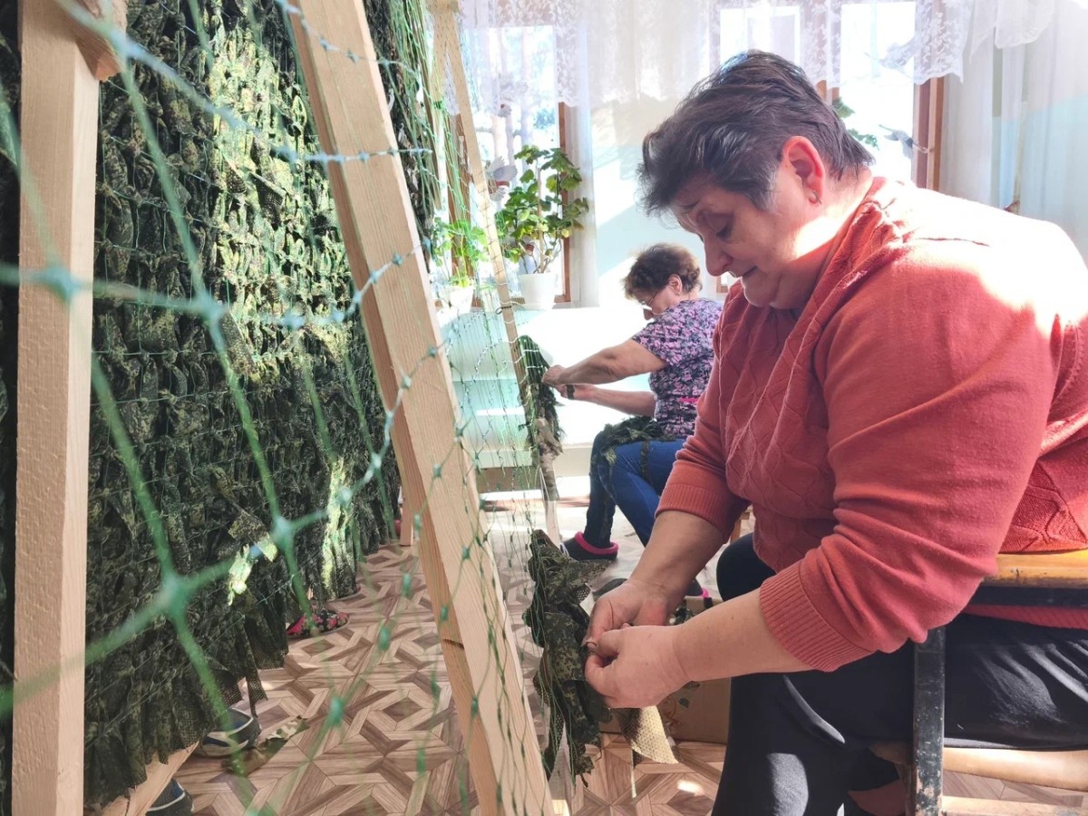 Сейчас селяне плетут маскировочные сети. Что и говорить, за дело они взялись с энтузиазмом. В среднем в здании клуба ежедневно работают 10-15 человек. Плечом к плечу трудятся и стар, и млад. Молодёжь не отстаёт от пенсионеров.