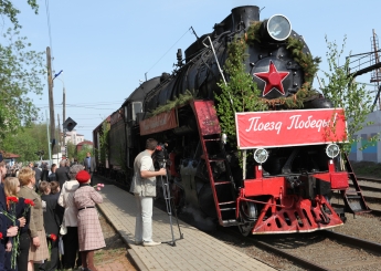 Всего через несколько дней этот состав отправится в путь. Это шесть платформ с техникой военных лет, два вагона-теплушки с полевой кухней и фотозоной. Во главе поезда – легендарный паровоз серии Л-4302,изготовленный на Ворошиловградском тепловозостроительном заводе.