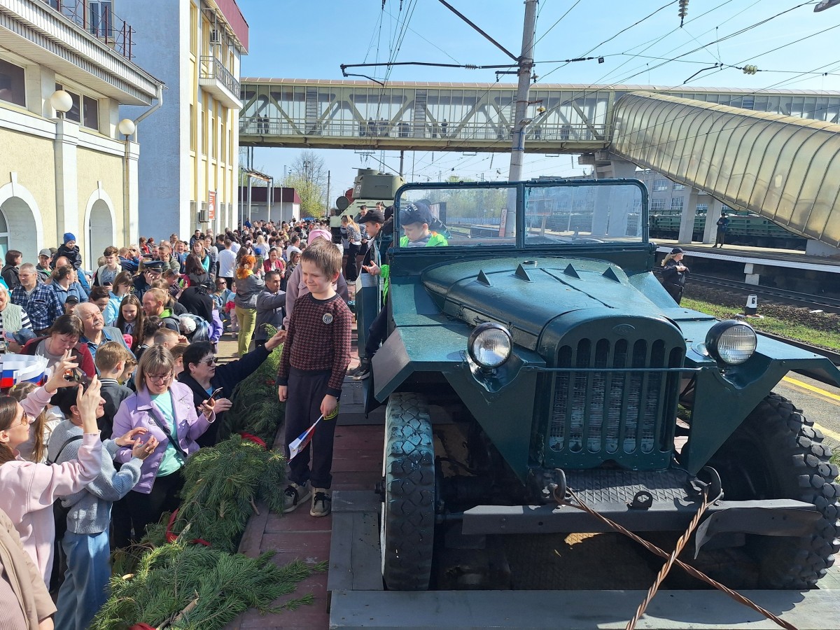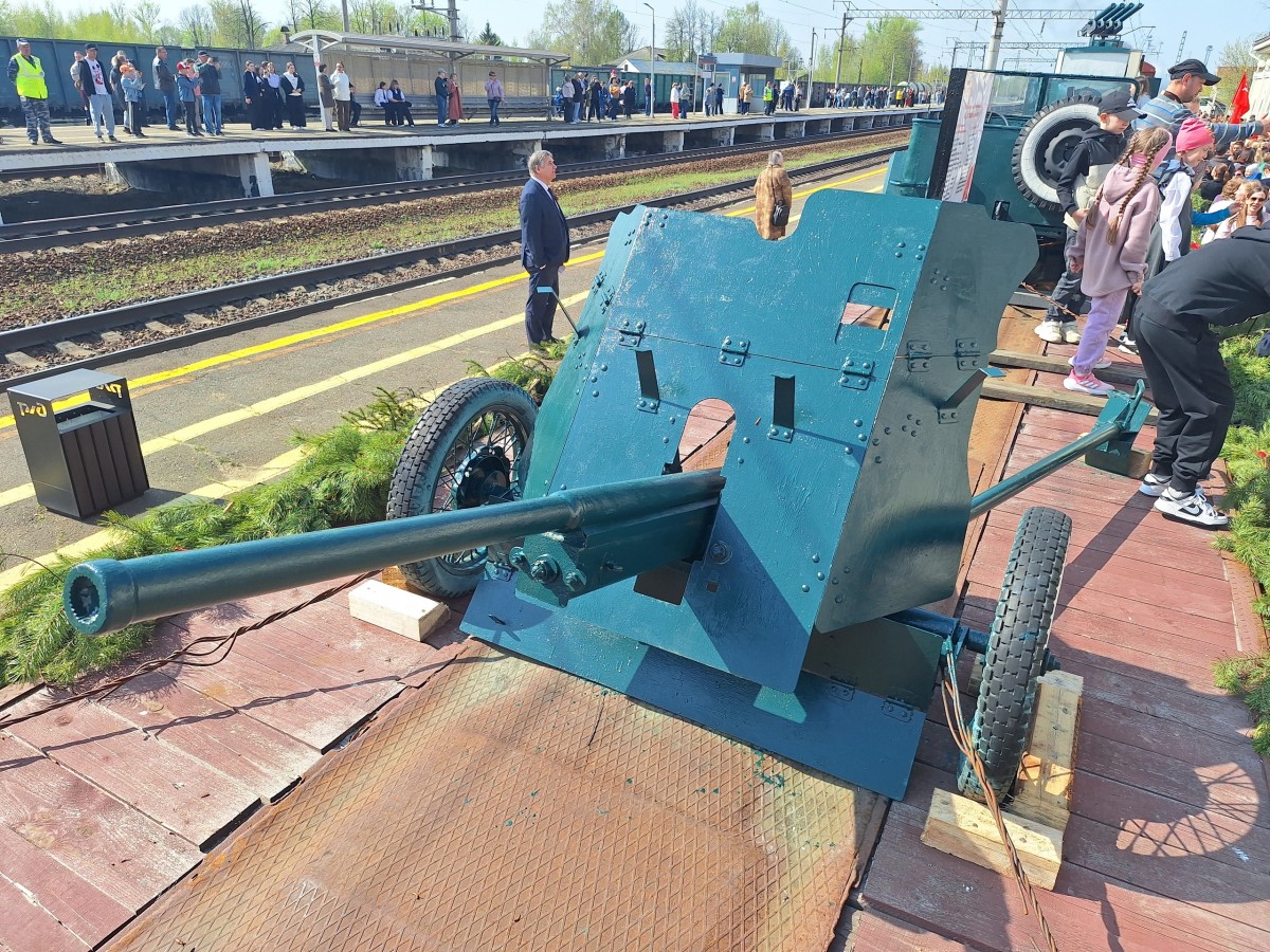 На шести открытых платформах «Поезда Победы» в Вязники прибыла и сохранившаяся боевая техника Великой Отечественной войны. Среди них 57 мм противотанковая пушка ЗиС-2, которую бойцы называли «Сталинским дыроколом». На отдельной платформе установлен легендарный танк Т-34 — лучшая боевая машина Второй мировой войны. Детище главного конструктора Михаила Кошкина. Танк представлен в версии с литой башней и 85-мм пушкой. А ещё здесь были самоходное истребительное орудие ИСУ-122, лёгкий фронтовой вездеход ГАЗ-67Б, установка залпового огня БМ-13 и счетверённая пулемётная зенитная установка на шасси грузовика ГАЗ-ММ.