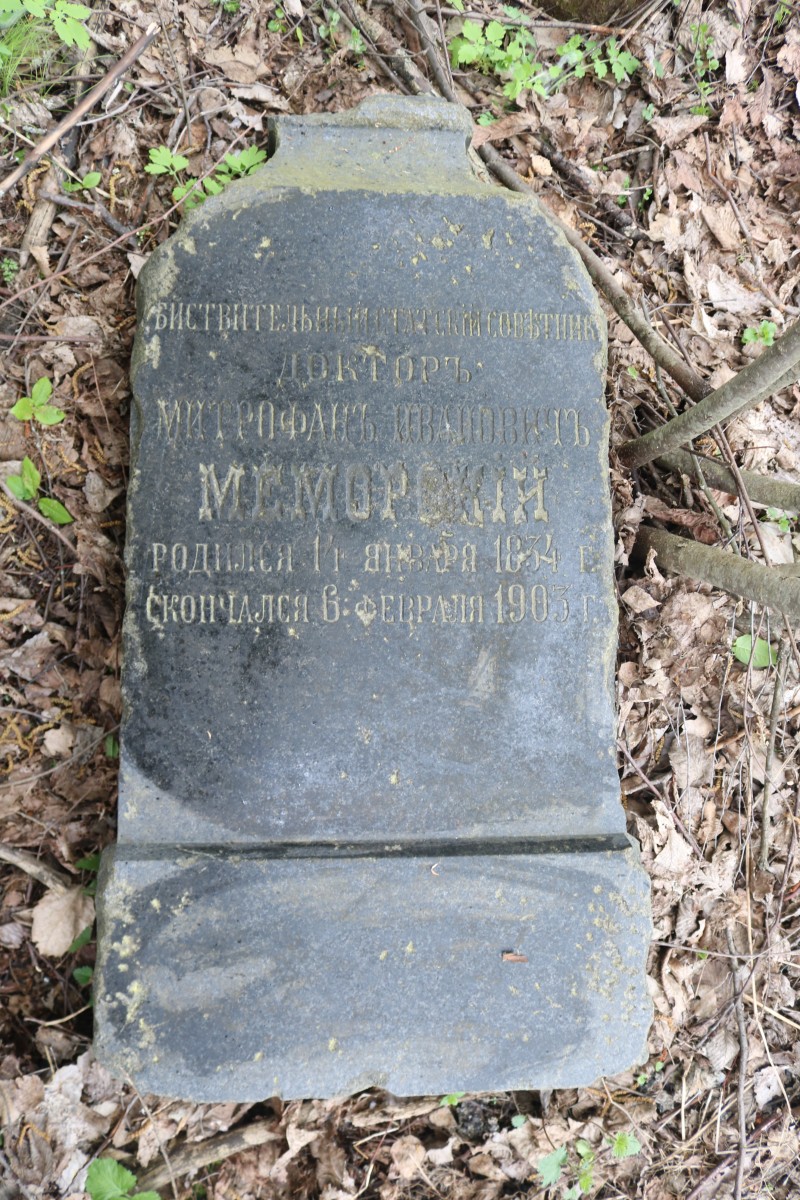 Митрофан Иванович часто приезжал в гости к родне на свою малую родину в Воскресенский погост и очень любил эти места. И когда 6 февраля 1903 года 69-летний отставной военный врач М. И. Никольский скончался, его по завещанию похоронили при Воскресенском храме Воскресенского погоста. После того, как церковь была закрыта и разорена, нарушили и местное кладбище. Снесли и могилу военного доктора Меморского.