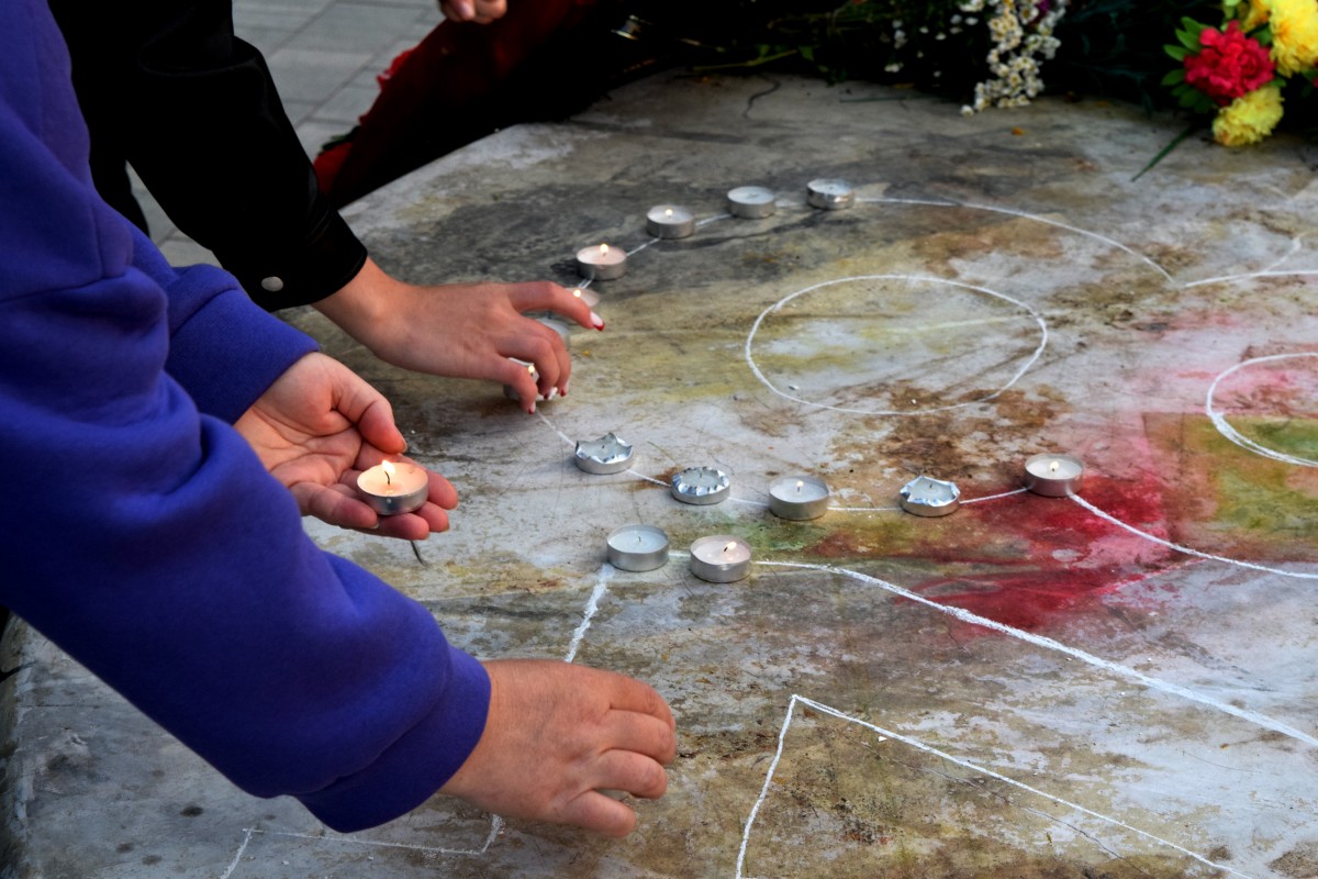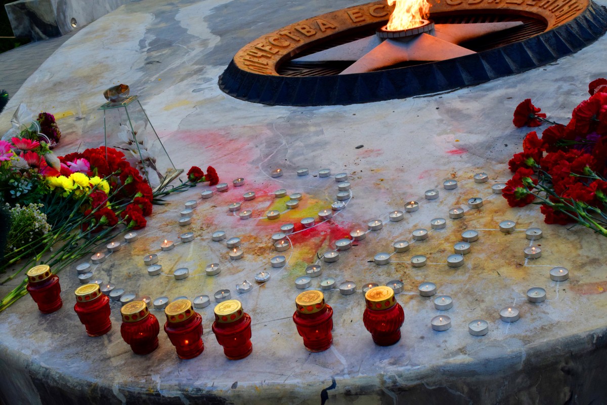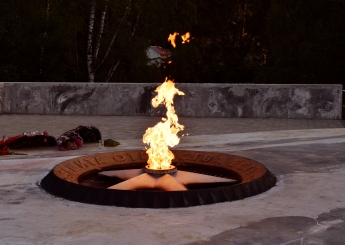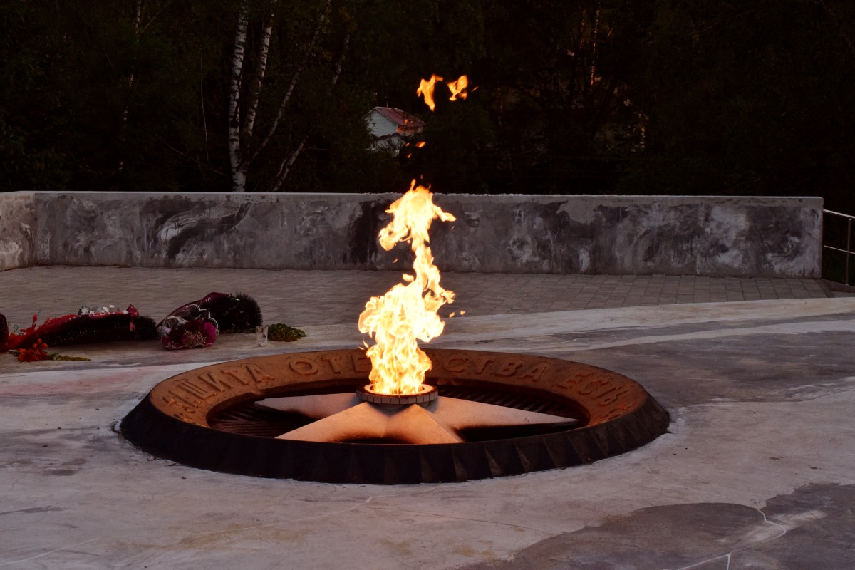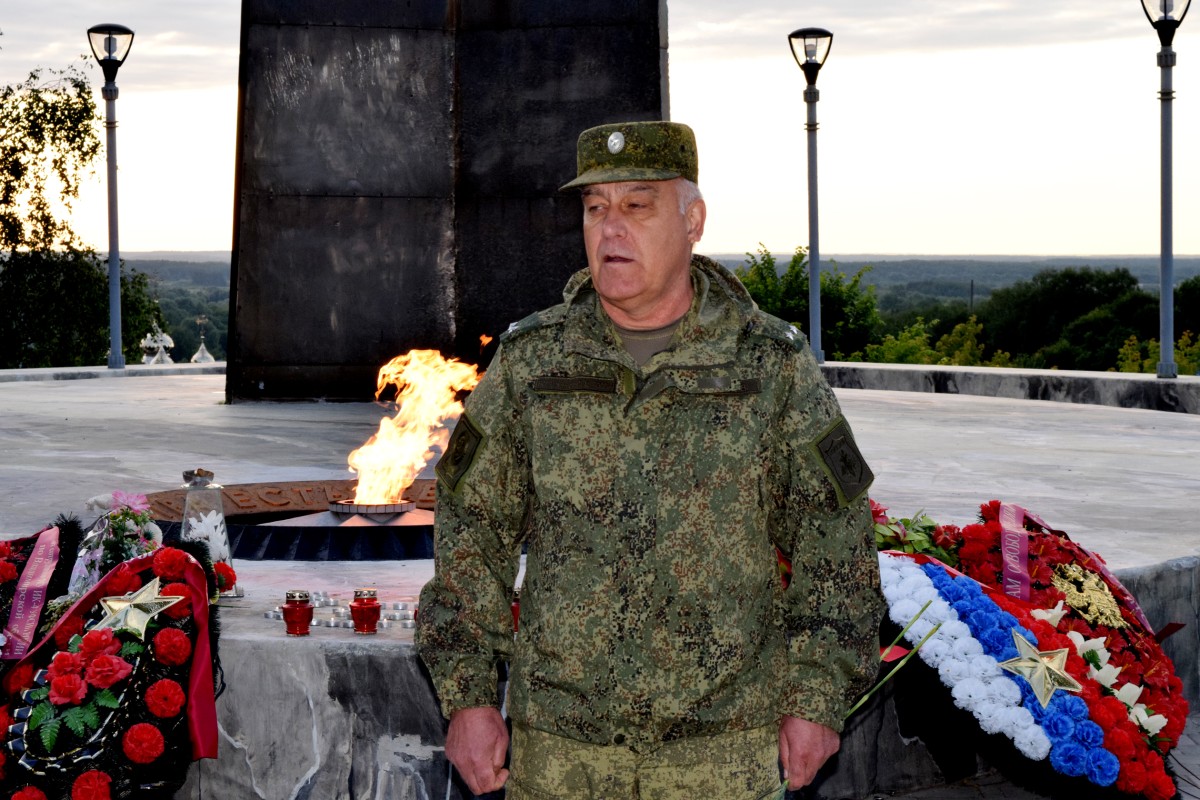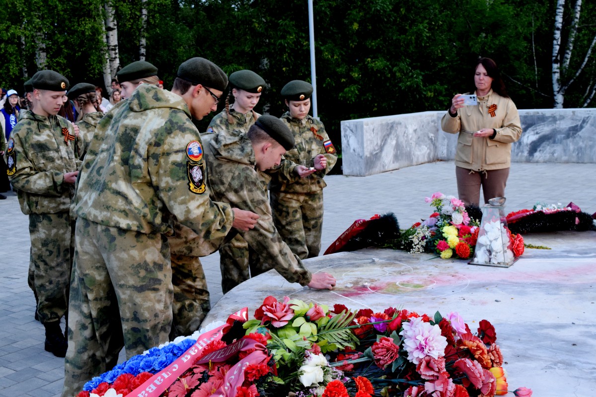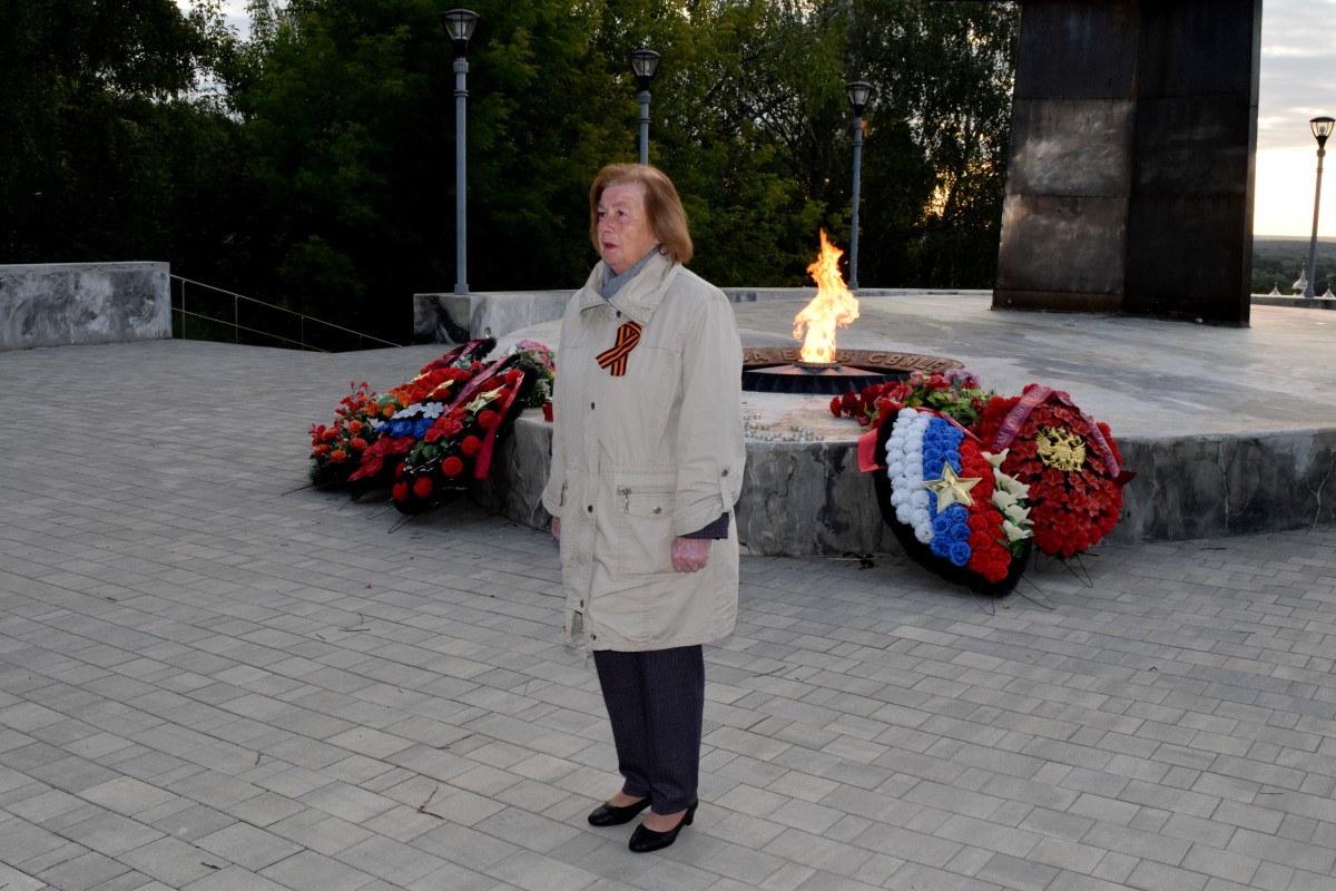 В честь защитников Отечества, ровно 84 года назад принявших первый удар врага, собравшиеся зажгли свечи памяти и выложили их у Вечного огня в виде числа 84.