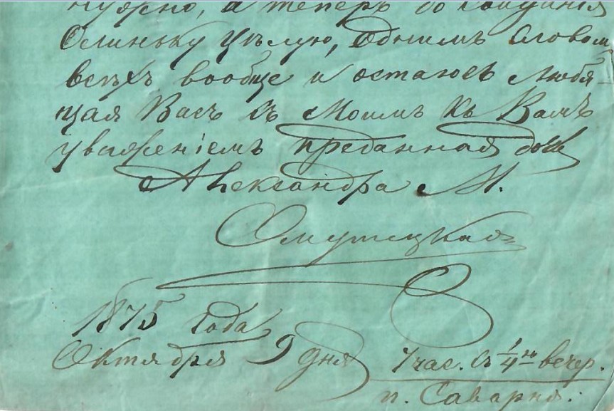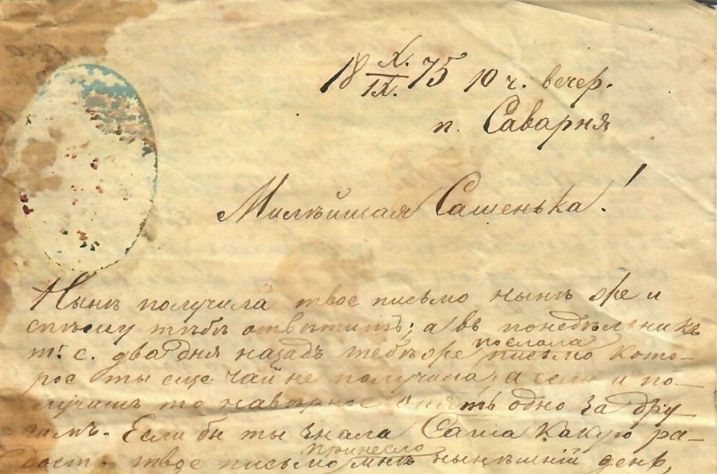 Действительно, эти чудом сохранившиеся исторические документы, о которых в конечном счете все позабыли, и родственники Вознесенских в наши дни нашли их почти случайно, позволяют заглянуть в позапрошлый век и увидеть то, что уже давно утрачено. Вот наглядный тому пример. В погосте Саварня Вязниковского уезда, который располагался неподалеку от нынешней федеральной автотрассы М7 в пределах нынешнего Сарыевского поселения, прежде существовал церковный комплекс из каменного Богородице-Рождественского храма, деревянных домов священника и диакона, а также здания церковно-приходской школы. Сегодня от этих построек ничего не осталось, кроме заросших травой, кустарников и древесной порослью груды битых красных кирпичей. А вот в письмах Александры Матвеевны Омутецкой, которые она посылала сестрам, содержится подробнейшее описание ныне утраченных зданий, в том числе с указанием числа помещений, их площади, количества окон, печей (в том числе с размерами каждой) и иных любопытных подробностей.