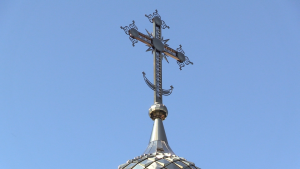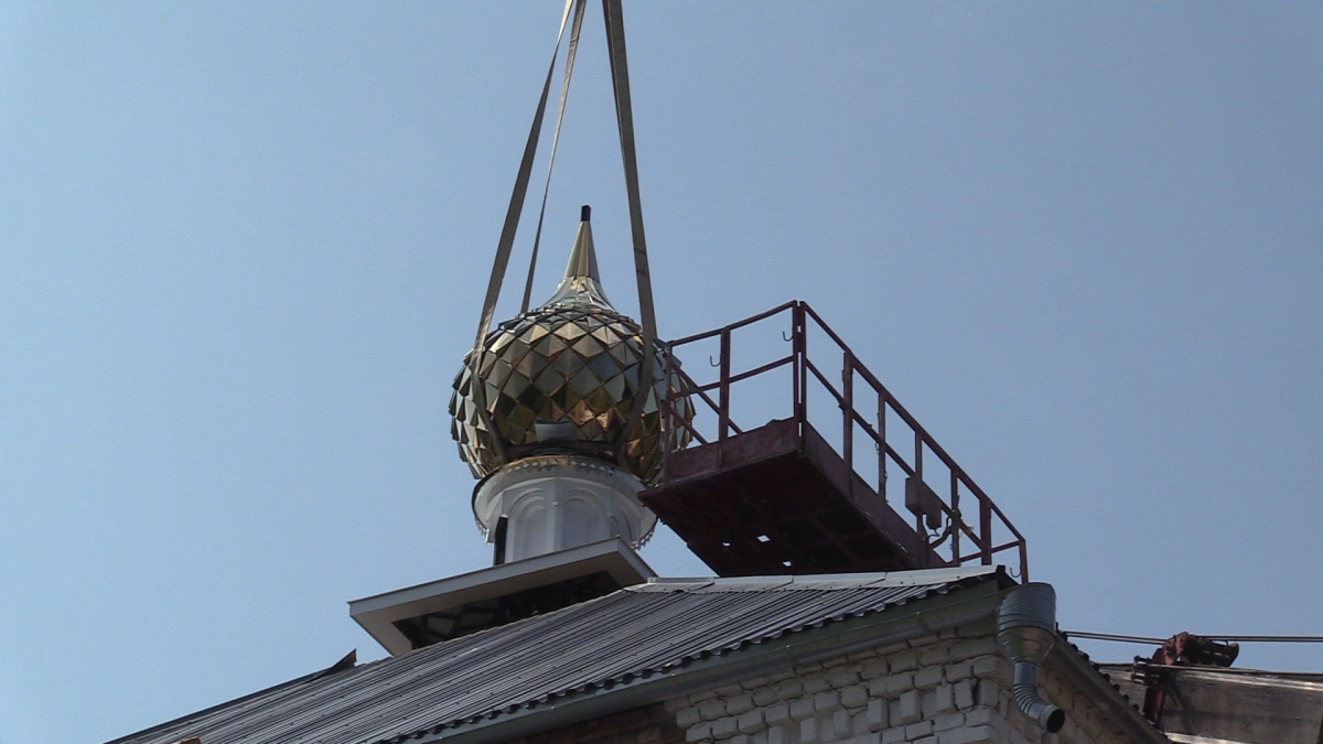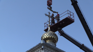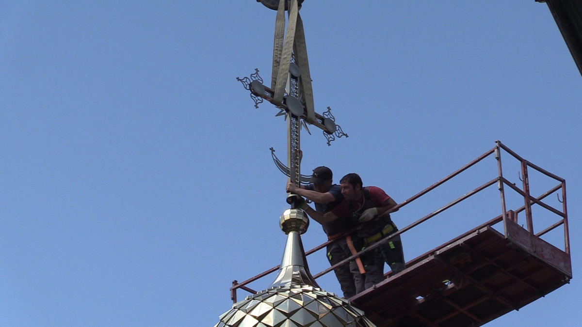 Затем специалисты приступили к поднятию на купол большого металлического креста, в основании которого красовался изящный полумесяц.
