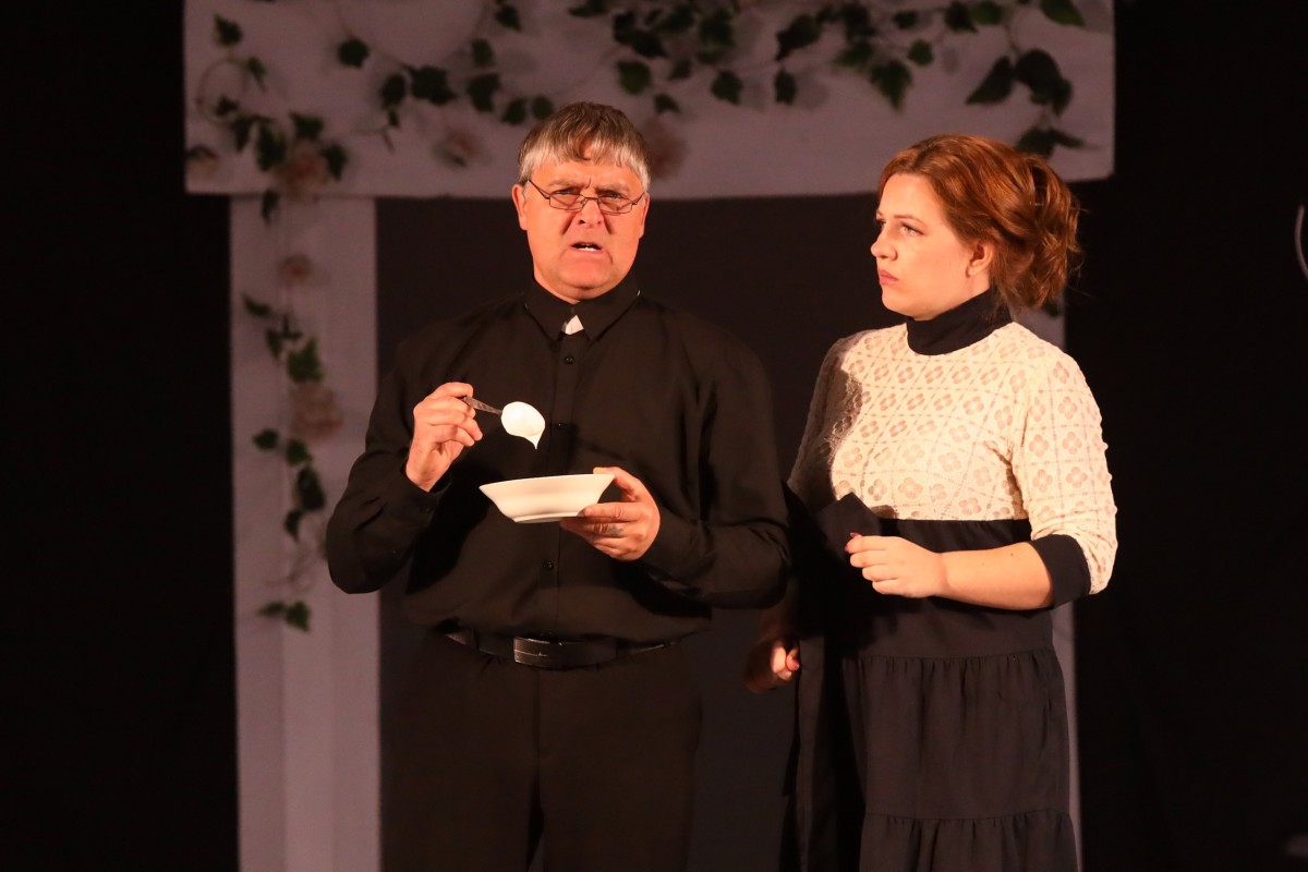 Зал был полон, действие не заставило себя ждать и началось минута в минуту, а точность, говорят, вежливость королей. Короли не короли, а играли никологорцы замечательно, и ожидания зрителей никак не обманули; наоборот – показали такие интересные актерские работы, что диву даешься. Если немного о фабуле пьесы, то она проста и забориста: два непризнанных таланта – Лео Кларк (Дмитрий Мысин) и Джек Гейбл (Геннадий Тимофеев) не слишком удачно замахнулись сгоряча на самого Шекспира, пускаются ради «бабок» в авантюру, прочитав (случайно) объявление в газете, и закручивают такой сюжет, что самому Вильяму нашему Шекспиру и не снился. В невероятной фантасмагории с переодеваниями, двусмысленностями и даже криминалом (куда в американской пьесе без него) участвуют и благовоспитанная Маргарет (Александра Калачева), невеста священника Дункана (Игорь Гусев), простоватый Доктор (Николай Крупнов), его незадачливый Сын (Николай Крупнов), влюбчивая Одри (Марина Жиганова) и, наконец, сама Тетушка Флоренс (Инесса Муромкина), из-за которой вся катавасия и началась.
