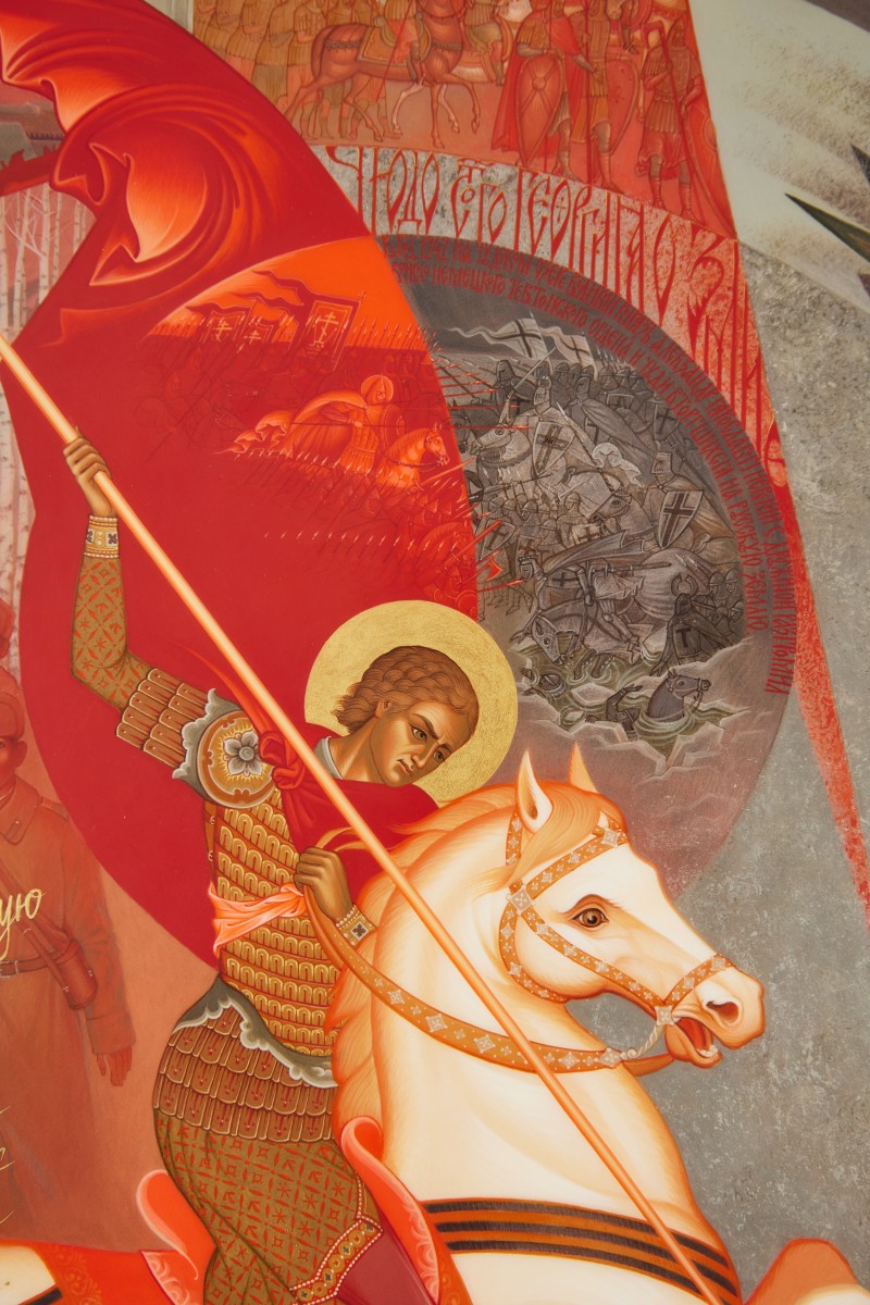 К 80-летию Победы советского народа в Великой Отечественной войне 1941–1945 годов и в память о своём замечательном предке Денис Владимирович создал большое художественное панно «Молитва Святому Георгию». Кстати, её текст здесь тоже прописан. В центре – Георгий Победоносец на коне поражает копьем огромного змея, в чёрных крыльях которого проглядывают вражеские солдаты и танки, заводы, концентрационные лагеря, католические священники, оправдывающие чудовищные злодеяния, и много других элементов трагической эпохи…