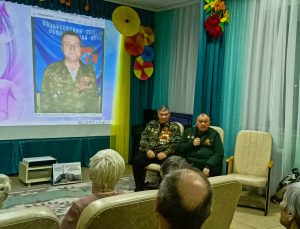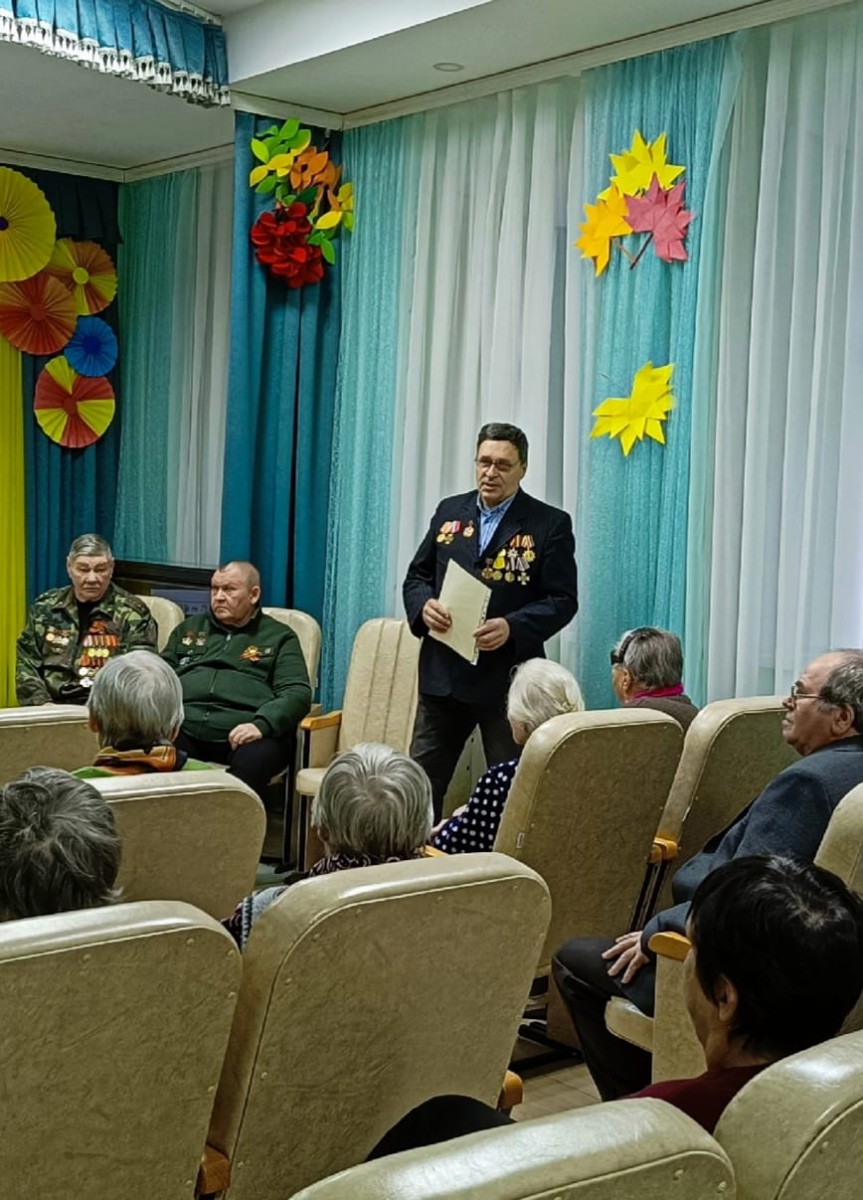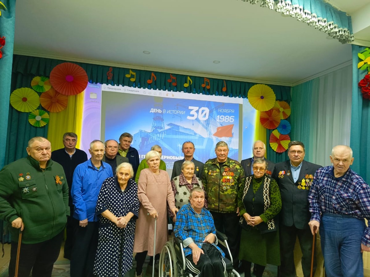 Первыми чернобыльцы пришли в Пансионат им. Е.П. Глинки, где их встретила заведующая Екатерина Самойлова, встреча проходила в актовом зале. Первым слово взял Владимир Лукичев, председатель местного отделения ООО «Союз Чернобыль». Владимир Юрьевич служил в части Чернобыль-2, видел пожар на станции, стал со своими сослуживцами ликвидатором первых дней аварии, а потом, когда личный состав части передислоцировали, добровольно остался, и выполнял тогда необходимые действия до середины мая. О той катастрофе он знает если не все, то очень и очень многое, чем в доходчивой форме и делится всегда со слушателями.
