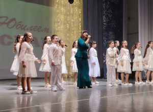 Со сцены сотрудников завода «ОСВАР» поздравляет Татьяна Маштакова вместе с образцовым театром песни «Сюрприз»