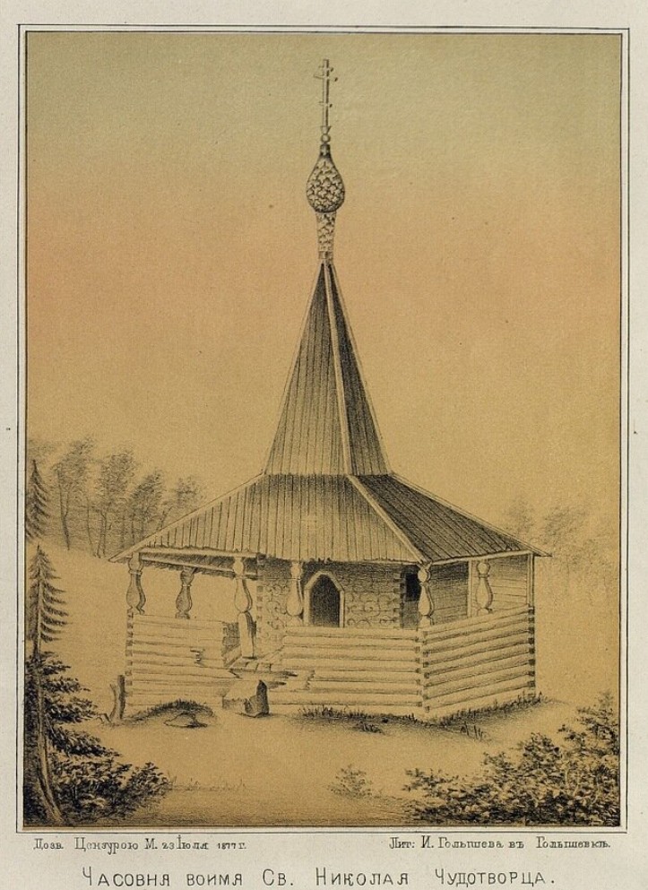 Часовня близ Нередичского погоста неподалеку от Мстеры, где был погребен последний князь Кривоборский. С рисунка И.А. Голышева.